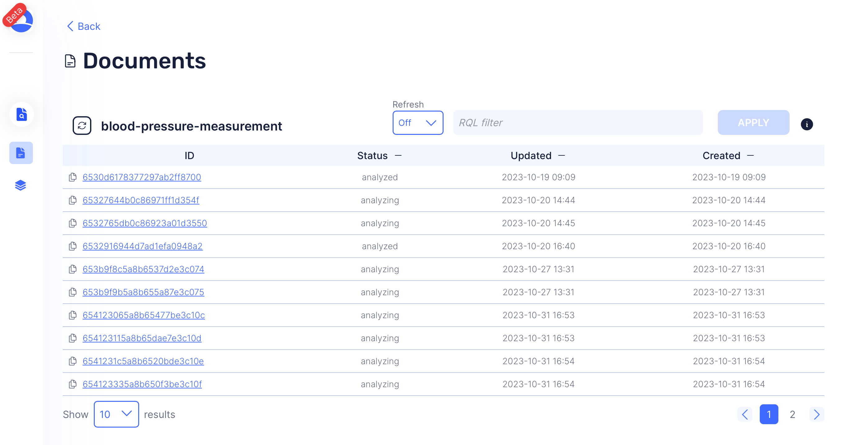 Head over to the control center, log in with your own user and go to Data -> Documents. Select the blood-pressure-measurement schema from the table and you'll see all blood pressure measurement documents that have been created, including the ones from your patients